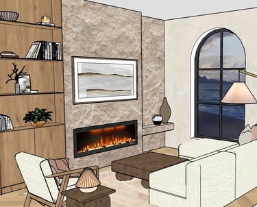 This living room was designed for a client in Malta. The waterfront property showcases expansive views of the Mediterranean Sea through dramatic arched windows inspired by traditional Maltese architecture. A sculptural stone fireplace, defined by its asymmetrical design, stands as a striking focal point within the space. Soft coastal-inspired furnishings in a light, airy palette balance the room, enhancing its sense of openness while echoing the surrounding seascape.